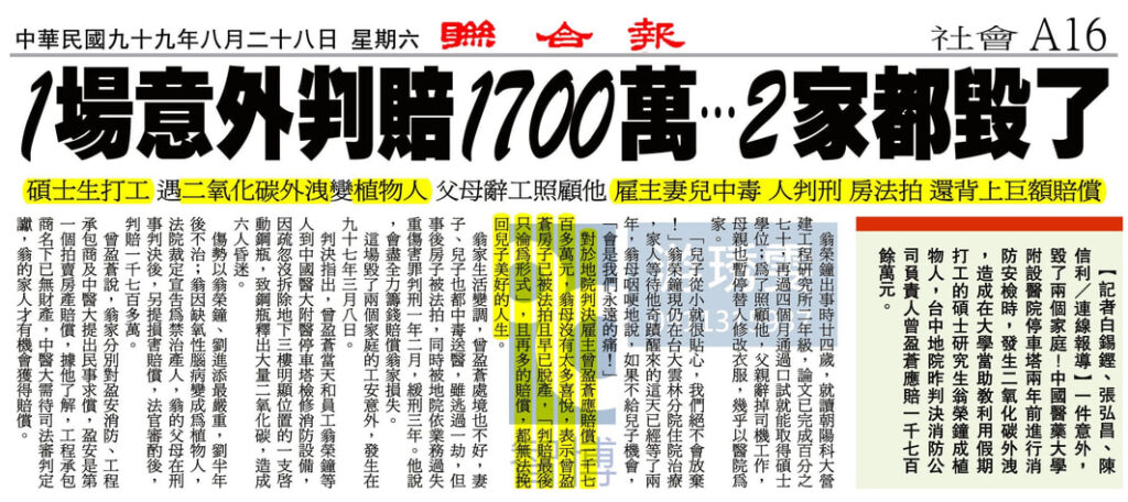 職災發生金額可能非常大,而且通常雇主都有一定的責任比例,面對員工及家屬的追償,企業若有投保雇主責任保險、團險,能將風險轉嫁給保險公司!