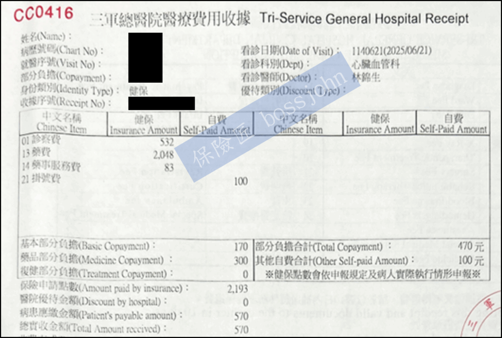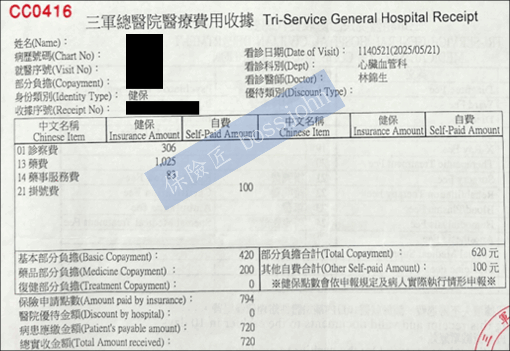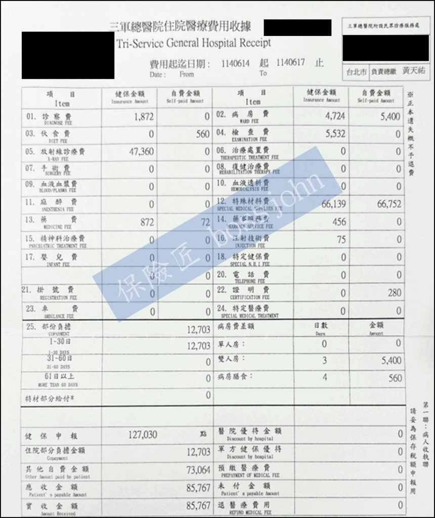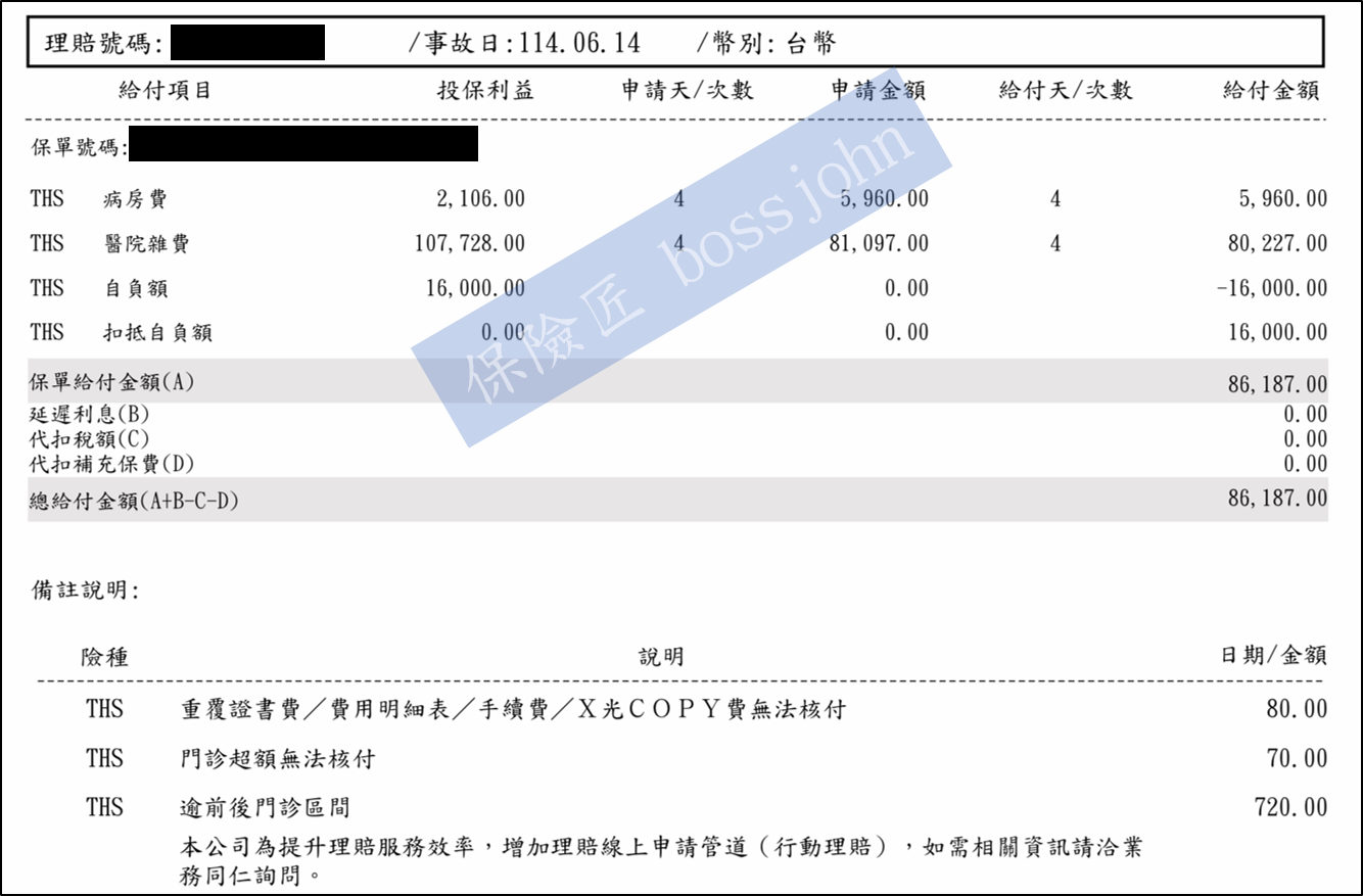 收據總金額扣除病房費、伙食費、證明書費(超過200不賠)、逾前後門診區間門診超額,合計80,227元