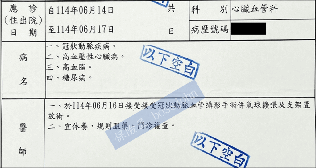 醫囑:住院4天,接受心導管術、氣球擴張術、支架置放術,術後宜休養,規則服藥,門診複查